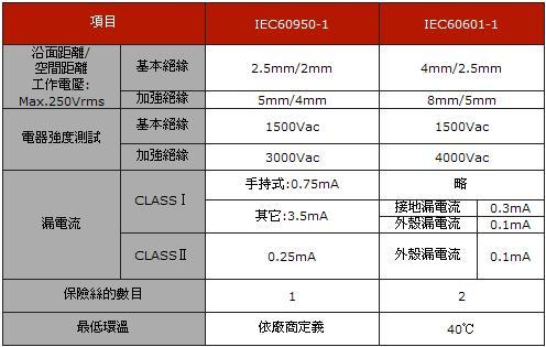 根據安規(guī)標準,EN60950-1 ClassI最大漏電流不可超過3.5mA;而EN60601-1最大漏電流不可超過0.3mA。量測時各別的安全距離、保險絲數量多有不同,其相關差異如下表列: